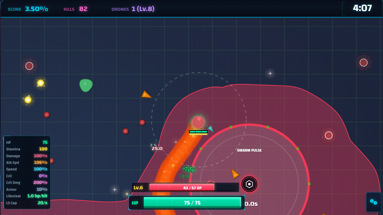 SwarmBlitz is a fast single-player roguelike that mixes territory control with swarm survival. You expand the map to level up, unlock drones, and build powerful synergies while enemy pressure constantly ramps up. Every push is a risk, overextend and the swarm will punish you.